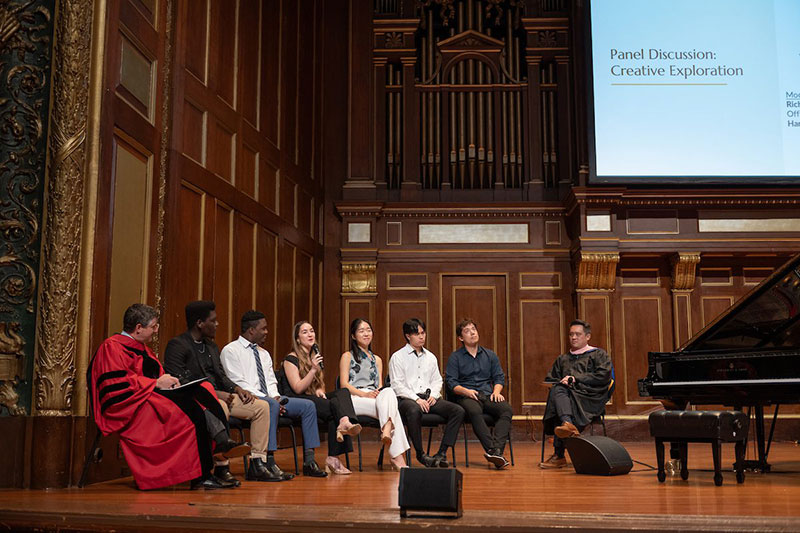 机会成为了一场专题讨论的核心。这场讨论由 NEC 当代表演艺术系(Contemporary Musical Arts Department)三位学生——声乐 Rosario Rivas ’27、小号 Woody Pierre ’27 和鼓手 Paul July Joseph ’28——以及 NEC 常驻钢琴三重奏 Trio Eris 成员——小提琴 K.J. McDonald ’25 GD, ’26 MM,大提琴 Annie SeEun Hyung ’26 MM,钢琴 Andrew Jun Chen ’24 MM, ’26 GD 参与。讨论主题为创意探索,由学术主任 Richard Giarusso 和艺术主任 Hank Mou 主持。